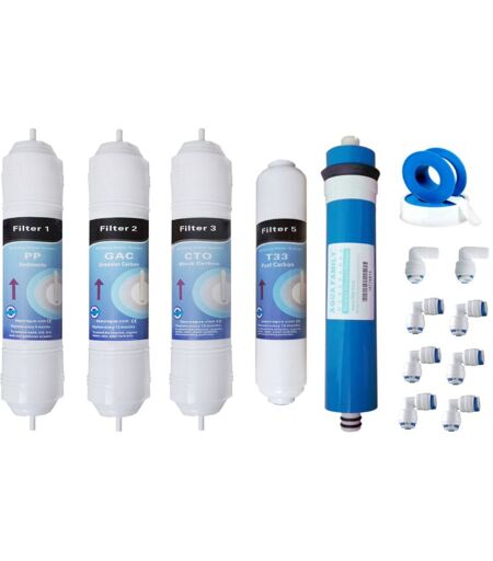 Ricambi osmosi inversa IN LINEA e membrana 50 GPD Tutti i filtri necessari per completare il funzionamento a osmosi inversa Il pacchetto contiene 1 x filtro polipropilene 10 1 micron 1 x filtro carbon estruso al carbone 1 x filtro carbon block al carbone 1 x filtro ai carboni attivi 1 x Membrana osmosi 50 GPD 1 x CARTUCCIA CARBONE BLOCK (GAC10) Cartuccia con carbone attivo per pre-post filtrazione di impianti d'osmosi e per apparecchiature di declorazione. Con la sua particolare struttura interna garantisce il massimo assorbimento e un tempo di contatto elevato. E' particolarmente efficace eliminando dall'acqua cloro e derivati, sapori e odori, sostanze volatili, pesticidi, insetticidi. NB. Non utilizzare in acque microbiologicamente inquinate senza una preventiva disinfezione. Dopo la prima installazione effettuare un lavaggio di 5 minuti. Nel caso si utilizzi l'acqua prodotta per bere o ...