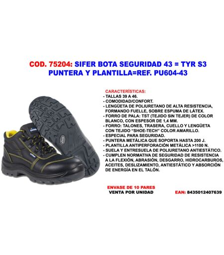 Gli stivali antinfortunistici SIFER/SAFETY BOTA SEGURIDAD 43 TYR S3 offrono una protezione superiore con punta rinforzata e suola antiscivolo Plantpu604. Pensati per ambienti di lavoro esigenti, garantiscono comfort e durata. Il loro design ergonomico e i materiali di alta qualità li rendono un'opzione ideale per chi cerca sicurezza e comfort sul lavoro. ...