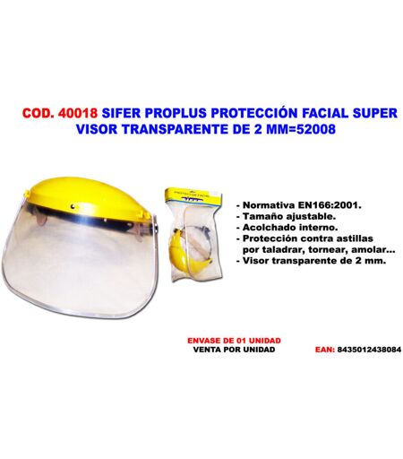 La PROTEZIONE FACCIALE SUPER VISOR TRASPARENTE SIFER PROPLUS 2 MM52008 è una visiera di alta qualità progettata per offrire la massima visibilità e protezione. Realizzato in materiale trasparente da 2 mm, è leggero e confortevole, ideale per ambienti di lavoro che richiedono sicurezza e protezione da schizzi e particelle. ...