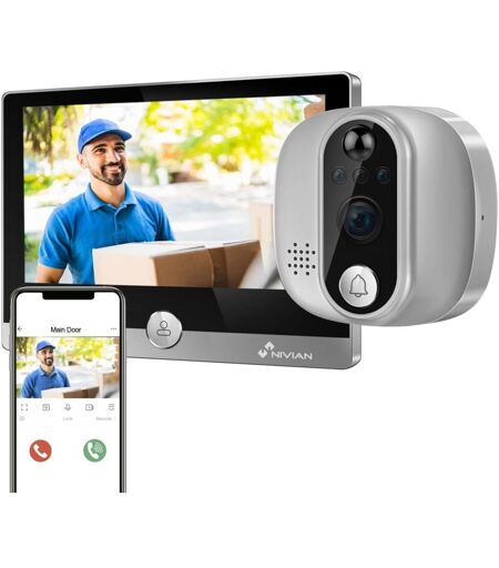 NIVIAN Spioncino Digitale WiFi - Videocamera Full HD con Batteria e Campanello, Audio Bidirezionale, Rilevamento PIR e Visione Notturna App e