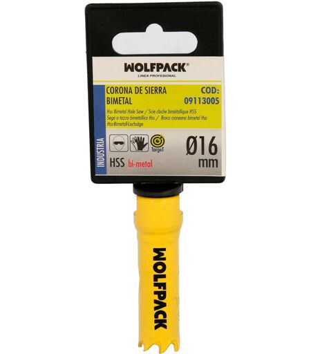 WOLFPACK Lame bimetalliche ø 16 mm. temprate termicamente, base rinforzata. corona per legno, punta per fori in legno, acciaio, ferro, plastica, ecc.