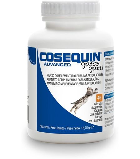 COSEQUIN - ADVANCED - Descrizione Mangime complementare per le articolazioni. Componenti Glucosamina cloridrato (per fermentazione)(FCHG49), solfato di condroitina (bovino)(TRH122), gelatina (suino), stearato di magnesio, carbonato di calcio. Additivi per kg: manganese (solfato manganoso, monoidrat… ...