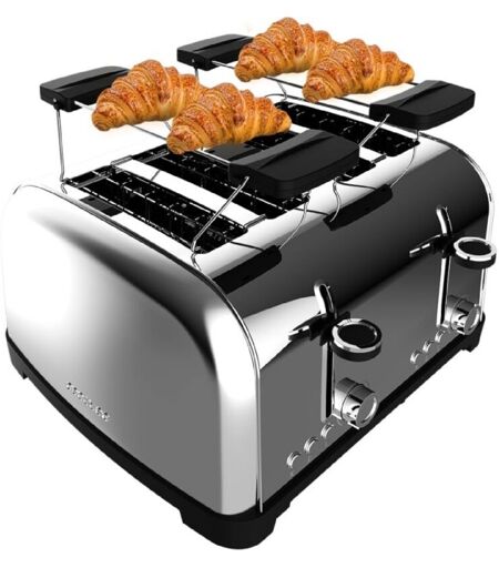 CECOTEC Tostapane in acciaio con quattro fessure corte, potenza di 1700 w e griglia scaldabrioche. -