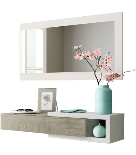 Ricevitore realizzato in melamina di alta qualità e lunga durata; Prodotto Certificato dal PEFC (Associazione Spagnola per la Sostenibilità Forestale), colore Rovere/Bianco, permette allo stile moderno per eccellenza di entrare nella tua casa. Il mobile da ingresso a 1 cassetto modello Moon è ideale per l'ingresso di casa o il corridoio principale; pensata per essere appesa al muro e arredare l'ingresso della tua casa con il massimo dello stile senza occupare molto spazio. Il mobile da ingresso è composto dalle seguenti parti: il pezzo superiore costituito da uno specchio con cornice bianca, il modulo inferiore costituito da un cassetto e un piccolo piano utile laterale, ideale per appoggiarvi un oggetto decorativo. Prodotto in un kit di facile montaggio, viene consegnato con le istruzioni di montaggio e i relativi strumenti per un montaggio ottimale. MISURE: 95 cm (larghezza) 26 cm (profondità) 19 cm (altezza). ...