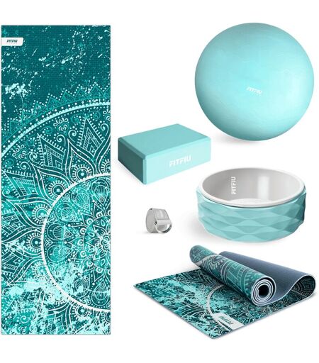 FITFIU FITNESS Pack da 5 accessori per yoga KITWELL-500 blu. Kit di accessori per yoga e pilates tra cui tappetino etnico, palla per pilates, blocco per yoga, ruota