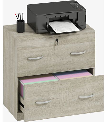 Mantieni il tuo ufficio organizzato con questa cassettiera Vinsetto, ideale per documenti e materiale di lavoro. I suoi due ampi cassetti includono guide metalliche per cartelle sospese. Il cassettone superiore con serratura e due chiavi protegge documenti importanti, mentre quello inferiore senza chiusura consente un accesso rapido. La sua struttura in melamina è resistente e facile da pulire, con maniglie metalliche e base con cuscini per evitare graffi. ...