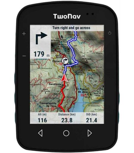 Terra - Prova l´emozione di esplorare senza limiti.Il navigatore outdoor per gli amanti dell´avventura che vogliono provare l´emozione di esplorare in sicurezza e senza limiti per ogni tipo di attività.Caratteristiche fisiches.Dimensioni 80 x 115 x 19 mm / Schermo Blanview / Risoluzione 480 x 640 pixel (3.7´´ ) / Peso 198 gr / Pulsanti 3 frontali + 4 laterali / Attacco QuickLock / Memoria interna 64 GB.Alimentazione.Sensore luminoso / Carica elettrica batteria 2600 mAh / Autonomia standard 15 h / Tipo batteria Integrata / Porta di comunicazione USB-C.Strumenti.GPS / Galileo / Glonass / BeiDou / SBAS-EGNOS / Bluetooth dual / Wi-Fi 5G / Altavoce / Barometro / Bussola digitale / Accelerometro.Incluso nel GPS.Carta Germania Topo Full, 6 mesi SeeMe, Supporto QuickLock pipa/manubrio bici (2 livelli), Cavo USB-USB-C, App TwoNav Premium (Android/iOS), App Link (Android/iOS), Spazio personale su Cloud GO, 6 mesi abbonamento Piano TwoNav PRO Un plus di sicurezza per te.Visione perfetta anche alla luce del sole Con il suo grande schermo vedrai oltre la tua posizione attuale, anticiperai ciò che ti aspetta senza affaticare gli occhi, esplorerai tutto ciò che ti circonda con la certezza di non perderti in un terreno sconosciuto.Terra è un GPS molto leggero e portatile che puoi usare comodamente in una mano durante i tuoi percorsi di trekking o fissarlo sulla tua bici, portarlo sempre con te e usarlo su terreni sconosciuti o sentieri non segnalati.Con i suoi 4 pulsanti laterali avrai il controllo totale anche con i guanti nelle giornate di pioggia.Preparati a resistere alle tue avventure Terra è il tuo alleato in montagna, con esso puoi caricare innumerevoli percorsi e persino crearli punto a punto direttamente sullo schermo del GPS.Se un percorso non ti convince, adattalo a te modificandone il tracciato, crea bivi e varianti.Ricordati di portare con te diverse carte dell´area che stai per visitare, con Terra lavorerai con più carte contemporaneamente, così otterrai maggiori dettagli di tutti i percorsi e le scorciatoie non segnalati.Spostati sulla carta e troverai altri punti di interesse vicino alla tua posizione, approfittane per visitarli.Precisione e affidabilità nelle tue uscite Terra lavora con 4 reti di posizionamento con copertura globale (GPS + Galileo + Glonass + BeiDou) Terra ti seguirà in ogni momento e rileverà un segnale satellitare ovunque tu sia.A differenza di uno smartphone, Terra è molto più potente in quanto la sua precisione di registrazione è più dettagliata.SeeMe:la sicurezza che stavi cercando Il servizio esclusivo di TwoNav con il quale puoi ritrasmettere la tua posizione esatta in tempo reale per monitorare i tuoi percorsi, mantenere la tua sicurezza e garantire la massima tranquillità ai tuoi familiari.Carte incluse, fidati Terra include la cartografia del tuo paese in modo che tu possa ottenere il massimo dalle tue uscite:una carta di base OpenStreetMap e una carta topografica altamente accurata (IGN, TomTom, OSM, Ordnance Survey,... ...