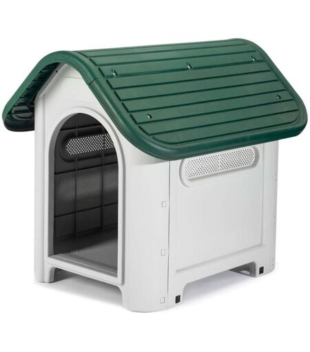 Cuccia in resina super resistente per cani o piccoli animali domestici . Include una grata laterale per una migliore ventilazione. Non sono necessari attrezzi per il montaggio. È facile da montare e pronto all'uso in pochi minuti. Le misure esterne sono 75x59x66 cm e il peso è di 6 kg. È realizzata in resina e si monta con incastri a pressione. Ha un tetto a due falde. È dotata di un pavimento su cui si possono appoggiare coperte o materassi per migliorare il comfort dell'animale. Si consiglia di lasciare uno spazio riservato alla sua installazione di 80x60 cm. Caratteristiche: - Misure esterne: 75x59x66 cm. - Misure della porta: 26x41 cm. - Peso: 6 kg. - Materiale: resina. - Tipo di giunto: giunti a pressione. - Colore: Beige / Verde. - Tetto: Due falde. - Pavimento: Sì. - Finestra: No. - Spazio consigliato: 80x65 cm. ...