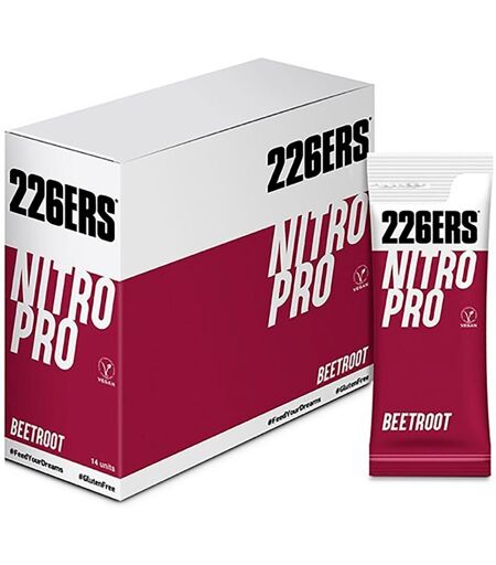 NITRO PRO: IL NITRATO NATURALE DI 226ERS CHE MIGLIORA LE PRESTAZIONI. NITRO PRO di 226ERS si presenta in una confezione da 14 bustine monodose. Ogni bustina va sciolta in 150-200 millilitri di acqua. Si consiglia di assumerlo tra le due e le tre ore prima dell´allenamento, per un minimo di tre giorni e un massimo di sette, nelle settimane di carico elevato o di competizione.Caratteristiche:- 226ERS ti offre NITRO PRO, un nuovo integratore alimentare in polvere che apporta 400 mg di nitrati per migliorare il trasporto dell´ossigeno e il sistema immunitario.- L´ossido nitrico è una molecola essenziale per l´organismo e la salute, che può anche contribuire a migliorare le prestazioni fisiche e sportive.BENEFICI DI NITRO PRO:- Integratore alimentare in polvere a base di concentrato di barbabietola e estratto secco.- Ogni dose di NITRO PRO apporta 400 mg di nitrati in modo naturale senza additivi chimici o zuccheri.- Assumendo nitrati si ottiene un aumento dell´ossido nitrico nell´organismo, che agisce come vasodilatatore, dilatando i vasi sanguigni, ottenendo un maggior afflusso di sangue nei muscoli, migliorando così il trasporto dell´ossigeno e, di conseguenza, le prestazioni.- L´aumento dell´ossido nitrico è efficace per gli atleti in periodi di carico elevato o di competizione, assumendo 400 mg di nitrati prima dell´allenamento per periodi di 3 a 7 giorni consecutivi.- Inoltre, l´ossido nitrico è anche un complemento perfetto per chi vuole prendersi cura della propria salute in generale, grazie agli effetti positivi che ha sul mantenimento del sistema immunitario e sulla protezione delle arterie, dei polmoni, del cervello, del fegato, dell´utero e del pancreas. ...
