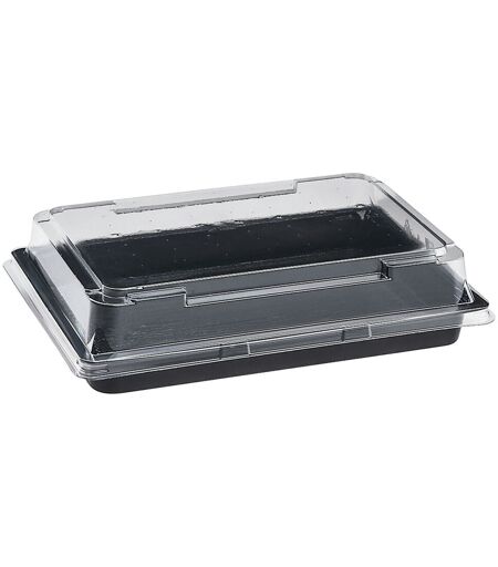 Box per sushi da asporto in plastica (PET) Box in plastica dura di alta qualità e di colore nero, ideale per il sushi da asporto. Consegnata con coperchio in plastica che si fissa ad incastro al box e rende visibile il contenuto, di modo che anche il cliente possa apprezzare l'aspetto estetico del cibo. Resistente a temperature fino a 70°C. ...