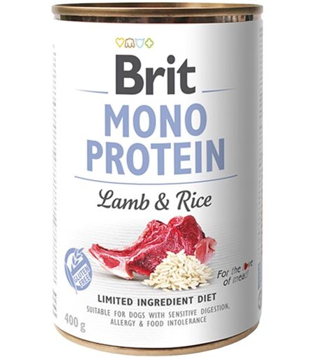 Alimento umido per cane con Agnello & Riso Monoproteico. GLUTEN/GRAIN FREE. (Scatolette da 400g). Composizione: 72% agnello (carne di agnello, polmone, fegato, cuore), 23% brodo di agnello, 4% riso, 1% minerali. ...