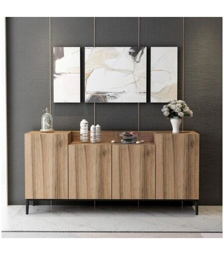 Madia Ellaria 4 ante noce 160x42x75h Caratteristiche: Madia 4 ante. Materiale truciolare spessore 18 mm. Rivestimento in melaminico. 4 ante. Ripiano superiore con doppia altezza. 2 ripiani interni. Colore noce. Piedi in metallo nero. Misure: 160x42x75 H cm. ...