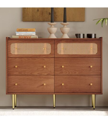 REDOM Cassettiera per camera da letto 6 cassetti - Credenza in rattan con gambe in metallo per soggiorno camera da letto noce - 120 x 40 x 90 cm