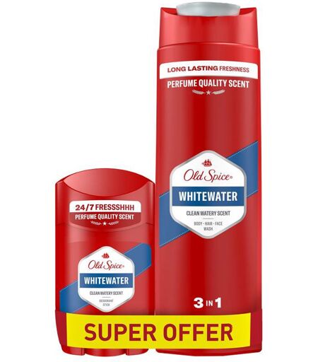 Old Spice Whitewater, , Set corpo da uomo per uomo, Il set contiene: Old Spice Whitewater deodorante solido per uomo 50 g Old Spice Whitewater gel doccia 400 ml Caratteristiche: lava la pelle e rimuove le impurità lascia la pelle vellutata e liscia crea una ricca schiuma durante il lavaggio ha un buon profumo non lascia macchie sui vestiti non blocca i processi corporei naturali protegge efficacemente contro la sudorazione possibilità di creare una routine quotidiana Composizione: senza sali di alluminio ...