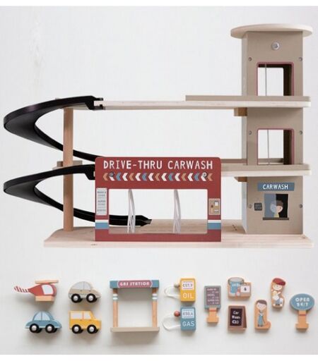 Il prodotto include: garage con autolavaggio, macchinine, elicottero, benzinaio, pompa per ruote, cartelli e dipendenti. Questo garage in legno e uno dei tanti set che si possono collegare al "railway set". È inoltre compreso di una piattaforma per elicotteri e tutte le componenti sono dipinte sia da un lato che dallaltro. Contiente 14 pezzi. Materiale: legno. Dimensioni: 45 x 23,5 x 38 cm. ...