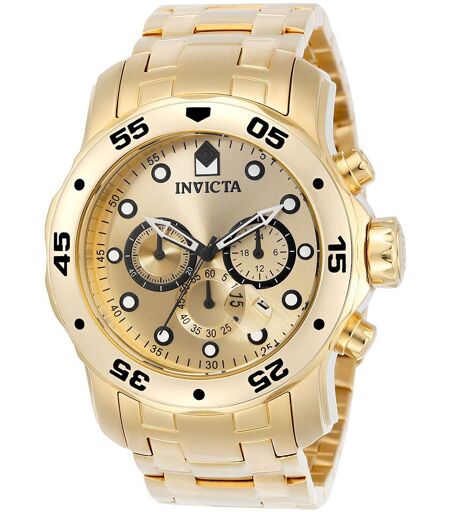 INFORMAZIONI GENERALI.Collezione:Invicta Quartz.Modello:Pro Diver.TARGET:Maschio.Casual.Adulto.MOVIMENTO E CARATTERISTICHE:SEIKO.Quarzo.Cronografo.Data.Cronometro.CASSA:Acciaio inossidabile.Oro giallo.Spessore 17mm.Diametro 48mm.CINTURINO/BRACCIALE:Acciaio inossidabile.Oro giallo.Larghezza 26mm.Lunghezza 215cm.QUADRANTE:Oro giallo.Metallo. ...