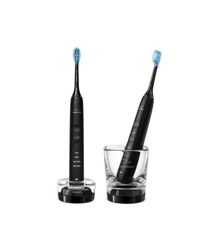 2 Spazzolini elettrici Philips Sonicare DiamondClean 9000 Neri, sensore pressione, 4 modalità di spazzolamento, 3 livelli di intensità, 62.000 mov/min, SmarTimer, BrushPacer, 2 Testine C3 PremiumPlaqueDefence, 2 basi di ricarica, app Progress Report, 1 bicchiere ricarica ...