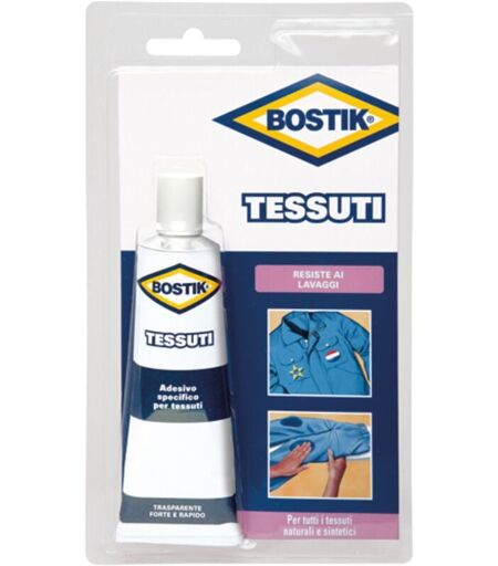 ADESIVO "TESSUTI" BOSTIK 50GR Contenuto : 50 gr. Adesivo resistente al 100% al lavaggio a macchina per la riparazione di tutti i tipi di tessuti e per attaccare le applicazioni - Ideale per riparare buchi e fessure in capi di abbigliamento come giacche, pantaloni, magliette, tende, sdraio, etc. ...