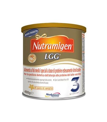 Nutramigen LGG - Descrizione Alimento a fini medici speciali a base di caseine estesamente idrolizzate, indicato per la gestione dietetica dell'allergia alle proteine del latte vaccino nei bambini dal 1° anno di vita in poi. La formula è priva di lattosio e contiene il probiotico Lactobacillus rham… ...
