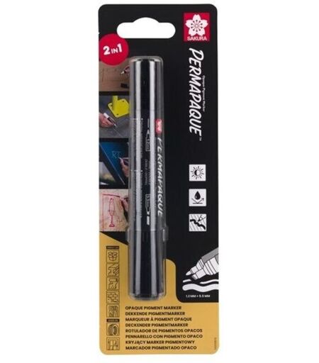 Pennarello Permapaque - Bifacciale, Nero Sakura Permapaque è un pennarello permanente unico e versatile con inchiostro pigmentato a base d'acqua. Il pennarello ha due punte: una fine da 1 mm e una larga da 5,5 mm, e non richiede di agitare o pompare prima dell'uso. Grazie allo speciale inchiostro Permapaque, garantisce una finitura opaca e di lunga durata. Caratteristiche: Ideale per l'uso su una varietà di superfici, tra cui carta patinata, legno, metallo, plastica, alluminio e vetro. Adatto all'uso in un'ampia gamma di settori. Inodore e atossico. Include due punte: larga per caratteri in grassetto e stretta per i dettagli. Specifiche: Temperatura di esercizio: 5 °C -40 °C Tipo di inchiostro: inchiostro pigmentato a base d'acqua Larghezza della linea: 1 mm e 5,5 mm Dimensioni: 135 mm Conservare orizzontalmente (sdraiato) ...