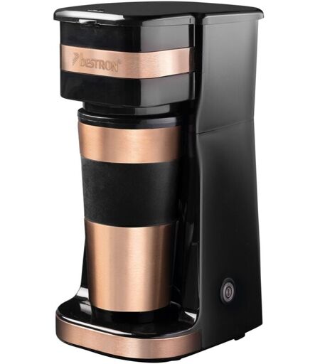 Bestron Caffettiera con tazza isolata, caffettiera da campeggio per caffè macinato con filtro, piccola caffettiera per 2 tazze grandi, 750 watt, acciaio inox, colore: rame ...