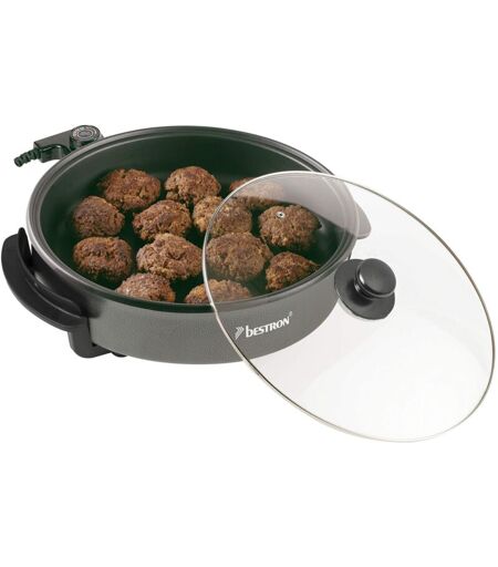 Padella multifunzione ampia e profonda (Ø 28,5 cm, altezza 4 cm) per cuocere, scaldare e friggere carne, verdure, risotti, sughi o pizza - Per servire direttamente in tavola una volta scollegata la spina: Ideale per feste in casa, perfetto per l'uso all'aperto (giardino, campeggio) - Facile da usare grazie alla regolazione progressiva della temperatura, Spia luminosa e coperchio in vetro con sfiato per vapore lavabile in lavastoviglie - Facile da pulire grazie al rivestimento antiaderente, Maniglia termoisolante e piedini antiscivolo per la massima sicurezza e stabilità - Contenuto: 1 Bestron Padella elettrica, Coperchio in vetro, Incl. suggerimenti per la presentazione, Lunghezza cavo: 109-111 cm, Potenza: 1500 Watt, Dimensioni: 38x33x17,5 cm, Peso: 2,16 kg, Materiale: Metallo/Nero, Colore: Nero, AHP1200 ...