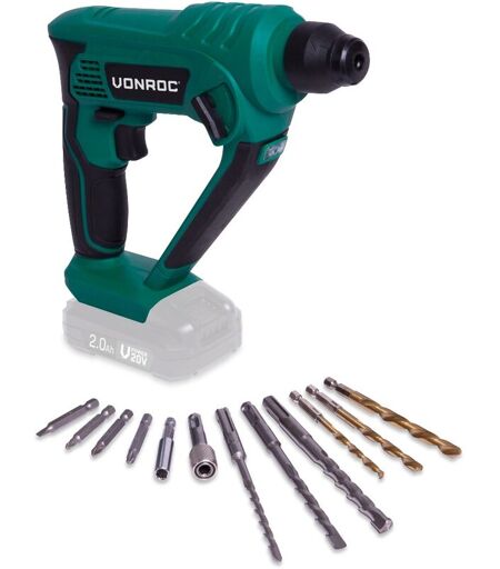 VONROC Martello perforatore VPOWER 20V 1.3 Joule - SDS plus. Incl. accessori e borsa degli attrezzi. Batteria e caricabatteria non inclusi