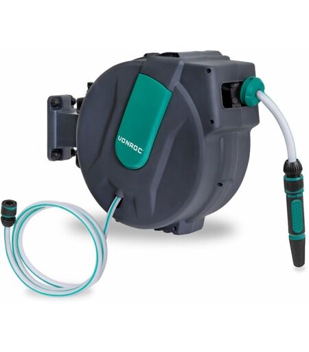 VONROC - Avvolgitubo retrattile automatico da parete con tubo da 25 m, tubo di collegamento, ugello, raccordi e connettore per rubinetto. Grigio