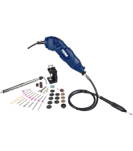 CTM1017 FERM Combitool con albero flessibile e supporto da tavolo, in valigetta con 40 accessori – Set completo! La macchina può essere sospesa al supporto regolabile in altezza, offrendo maggiore libertà e precisione grazie all’albero flessibile. Naturalmente, è possibile utilizzare l’utensile anche tenendolo in mano. Con il potente motore da 160 Watt, si raggiungono da 8.000 a 35.000 giri al minuto. La velocità è regolabile in modo continuo, permettendo di adattarla perfettamente al tipo di lavoro. Grazie ai due mandrini inclusi, è possibile utilizzare accessori con gambo da 2,4 mm e 3,2 mm. A cosa serve questo articolo? Il CTM1017 è l’utensile ideale per una vasta gamma di lavori fai-da-te, tra cui: Lucidare Pulire Forare Tagliare Incidere Fresare ...e molto altro! I vantaggi dell’utensile FERM: Utensile compatto e facile da usare Utilizzo universale grazie alla regolazione della velocità Accessori facilmente intercambiabili grazie al blocco dell’albero Fornito in una robusta ...
