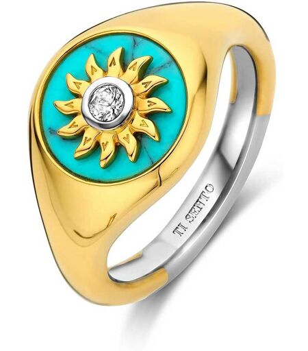 Anello Del Brand Ti Sento Milano. Anello In Argento Sterling Color Oro Di Colore Turchese. La Misura È 58. La Larghezza È 12,5 Mm. Lo Spessore Della Pietra È 3 Mm Il Peso È 0,00754. La Referenza È 12335tq/58, Materiale Gioiello: Acciaio, Argento 925, ...