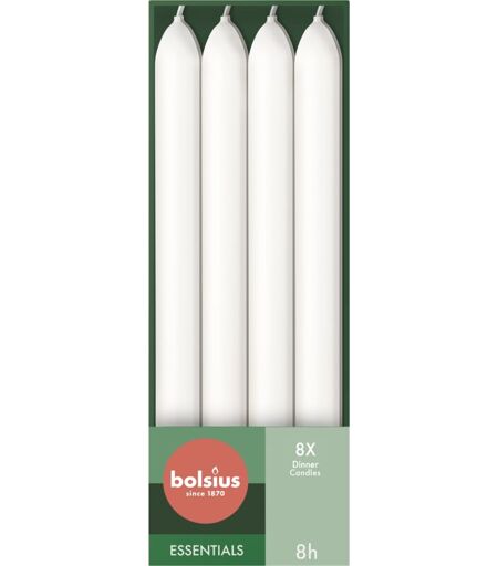 BOLSIUS Candele da tavola affusolate – Bianco – Confezione da 8 – 23 cm – Lunga durata di 8 ore – Inodore – Cera vegana naturale – antigoccia – senza olio di