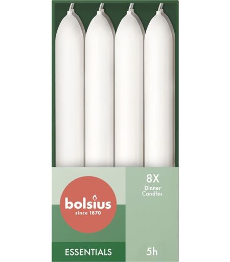 BOLSIUS Candele affusolate per cena – Bianco – Confezione da 8' – 17 x 2 cm – Lunga durata di 5 ore – Cera vegana naturale – senza gocciolamento – senza olio