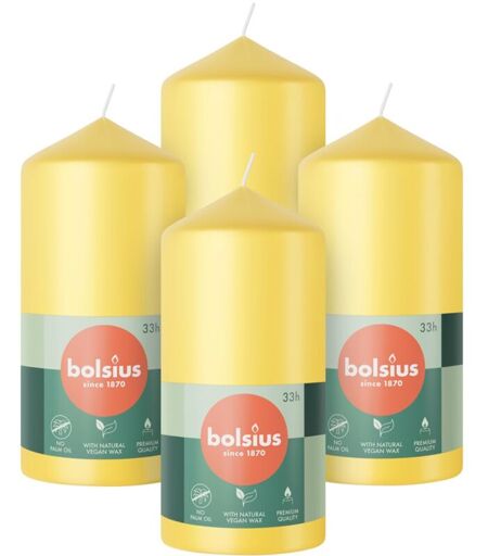 BOLSIUS Candele a colonna, confezione da 4 pezzi, 12 x 6 cm, candele decorative per la casa, lunga durata di 33 ore, inodore, cera vegana naturale, senza