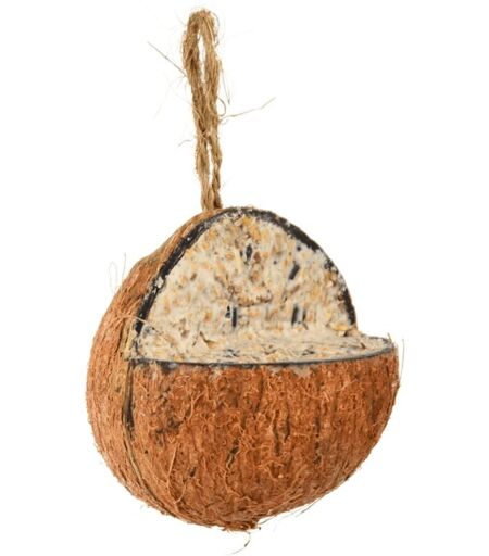 Simpatica noce di cocco che diventa una mangiatoia grazie al suo contenuto che è stato sostituito con del goloso cibo per uccellini selvatici. Il taglio a V permette agli uccellini di cibarsi facilmente e la corda inclusa di appendere la noce di cocco dove vogliamo Ingredienti: Cocco, sego di manzo, grano, mais, semi di girasole, sorgo, carbonato di calcio, corda di iuta Peso 350 g. ...