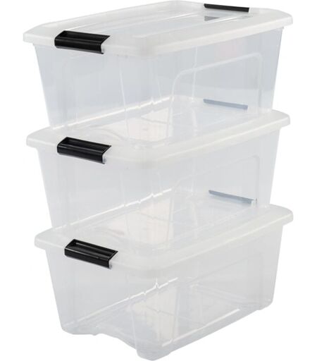 IRIS OHYAMA Scatole Portaoggetti in con Coperchio, 15L, Lotto di 3, Trasparente, Clip di Bloccaggio, Empilabile, Maniglia, Per Camera, Armadio, Ufficio,