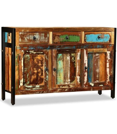 Questa credenza in stile antico in legno, con tre cassetti e tre scomparti, offre ampio spazio per conservare gli oggetti e vi aiuta a tenerli in ordine. Questa credenza è realizzata in legno massello rigenerato, il che significa che la credenza ha le caratteristiche di diversi legni come il mogano, il teak, il legno massello, il legno di mango, l'acacia, ecc. Il legno di recupero è robusto, stabile, durevole e bello. Avere questo mobile a casa metterà in mostra il vostro interesse per la salvaguardia delle risorse, la protezione dell'ambiente e lo sviluppo sostenibile. Ogni pezzo di arredo è unico e leggermente diverso dall'altro. I segni di usura conferiscono ad ogni pezzo un aspetto unico e si aggiungono al suo spettacolare stile vintage. Questo mobile è interamente realizzato a mano e la lavorazione artigianale si aggiunge al suo spettacolare stile retrò. Ogni processo di ricombinazione, lucidatura, verniciatura e ceratura è preparato in modo elaborato. L'assemblaggio è semplice. ...