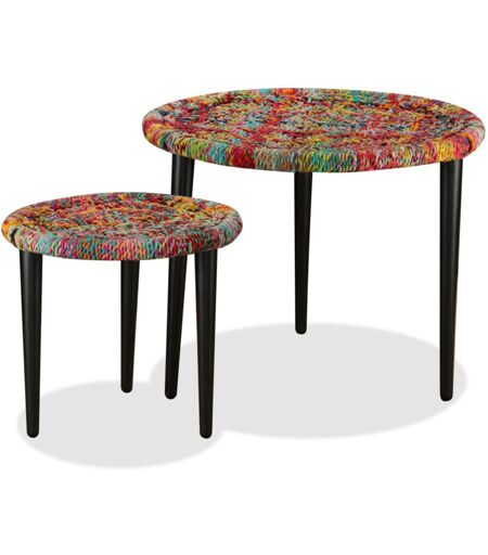 Questo set di tavolini da caffè, composto da 2 pezzi e interamente realizzato a mano con bellissimi e colorati dettagli in tessuto chindi, sarà un elegante aggiunta in ogni salotto. I tavolini, lavorati a intreccio, sono eleganti e pratici. Il loro design esotico farà di questi tavolini il punto focale di ogni spazio abitativo. Questi tavolini emanano un fascino naturale. I ripiani del tavolo, su cui è possibile posizionare oggetti decorativi come cesti di frutta, vasi o bevande e snack, sono decorati con dettagli colorati e intrecciati. Le solide gambe in acciaio conferiscono robustezza e stabilità. La consegna comprende 2 tavolini da caffè. Nota importante: I colori variano da un articolo all'altro, rendendo ciascun articolo è unico; la consegna è casuale. Colore: Multicolore Materiale: Dettagli in tessuto Chindi + telaio in acciaio verniciato a polvere Dimensioni tavolino grande: 59 x 47 cm (Diametro x A) Dimensioni tavolino piccolo: 40 x 39 cm (Diametro x A) Interamente realizzata ...