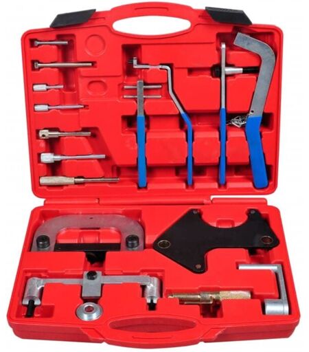 Questo set completo di strumenti di fasatura del motore di oltre venti strumenti consente di effettuare la fasatura corretta del motore durante la sostituzione della cinghia di distribuzione. Questo set è adatto per l'uso sulle auto più diffuse con motori a benzina o diesel. Adatto ai seguenti motori a benzina - 1.2 (codice motore D7F) ad es. Clio e Twingo - 1.2 / 1.4 / 1.6 (codice motore E5 E7F, E7J, K7M) ad es. Clio, Megane, Scenic, Kangoo - 1.4 / 1.6 16V (codice motore K4J, K4M dal 1998) ad es. Clio, Clio Sport, Megane, Scenic, Laguna, Espace - 1.7 / 1.8 / 2.0 (codice motore F1N - F3N, F3P, F2R - F3R) ad es. Clio, Megane, Scenico - 1.8 / 2.0 16V (codice motore F4P, F4R dal 1998) ad es. Clio, Clio Sport, Megane, Scenic, Laguna, Espace - 1.8 / 2.0 16V (codice motore F7P, F7R) ad es. Clio Williams, Megane, Spider, R19 - 2.0 / 2.2 (codice motore J5R - J7R, J5T) ad es. Safrane, Espace, Master, Traffic - 2.0 16V / 2.5 20V (codice motore N7Q, N7U) ad es. Laguna e Safrane e motori Volvo ...