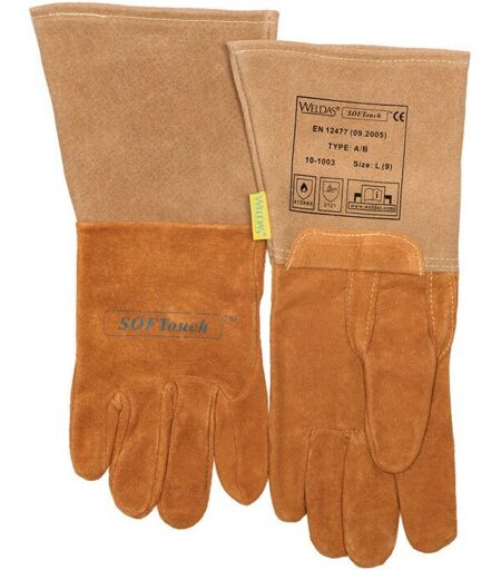 secondo la norma EN 388 · EN 407 · EN 12477 (09.2005) Versione A/B · gatto. II · Materiale: Pelle di maiale · Softouch® · Lato in suede all'esterno, lato inchiodato all'interno del palmo · con polsino in pelle spaccata · dito indice senza cuciture, quindi un buon controllo su fili di saldatura di piccolo diametro e bruciatore TIG ultraleggero · impedisce la combustione dalle cuciture · bassa abrasione · buona vestibilità · particolarmente elastico · Kevlar 3 volte® cucito · TÜV (TÜV Rheinland) testato: 21128415 002 · Applicazione: saldatura TIG Altre caratteristiche tecniche: · Resistenza all'abrasione: 3 · Resistenza allo strappo: 2 · Forza di puntura: 1 · Resistenza al taglio (prova di taglio): 1 · Versione: in dito indice scanalato e senza cuciture · Norma: EN 388, EN 12477 ...