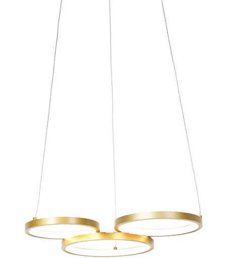 QAZQA Lampada a sospensione dorata con LED dimmerabile a 3 livelli 3 luci - Rondas La moderna lampada a sospensione Rondas crea un bellissimo effetto luminoso nella stanza con i suoi 3 cerchi luminosi. La lampada a sospensione è realizzata in plastica con alluminio e acciaio. Il suo colore oro la rende molto moderna. Rondas ha una lunghezza di 52 cm, una larghezza di 43 cm ed è regolabile in altezza; minimo 36 cm e massimo 160 cm. La piastra di montaggio ha un diametro di 22 cm e un'altezza di 4 cm. Il cavo è lungo 150 cm. I cerchi sono dotati di illuminazione LED non sostituibile con una potenza luminosa di 1260 lumen e 2700 Kelvin. Questo rende la lampada a sospensione una vera e propria centrale elettrica e emette molta luce! La luce può essere smorzata con il dimmer a 3 livelli, che è possibile azionare facilmente con l'interruttore a muro. La lampada a sospensione si adatta perfettamente in un ufficio o sopra il tavolo da pranzo. Dai al tuo interno un tocco moderno con Rondas! ...