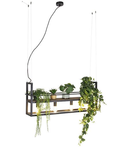 QAZQA Lampada a sospensione industriale nera con ripiano in legno 4 luci - Cage Rack Un design arioso con spazio per tutti i tipi di decorazioni divertenti! Ottima in cucina o sopra il tavolo da pranzo. Aggiungi (erbe) piante in cima per completare il tutto. La lampada a sospensione Cage è realizzata in metallo nero e ha un ripiano in legno. È realizzata in acciaio. È regolabile in altezza con un'altezza minima di 73,5 cm e un'altezza massima di 150 cm. È lunga 100 cm e larga 18 cm. La piastra di montaggio ha un diametro di 10 cm e un'altezza di 2,5 cm. Il cavo incluso è lungo 106,5 cm. La lampada ha quattro punti luce. Le lampadine non sono incluse, quindi assicurati di ordinare anche quattro lampadine E27 (max. 60W). Si prega di notare che il peso massimo sul Cage dipende dalla stabilità del soffitto! È una buona idea controllare questo in anticipo. Sceglierai questa attraente lampada a sospensione? Portalampada: E27 . Max 4 x 60 W, 230 V Adatto a: Incandescente, Algogene, ...
