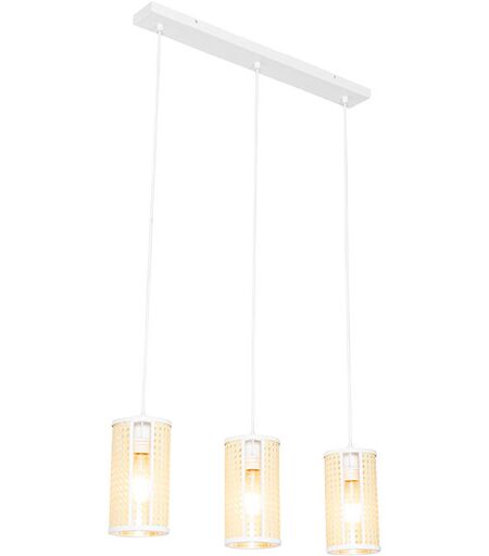 QAZQA Lampada a sospensione orientale bianca con rattan 3 luci oblunga - Akira La nostra lampada a sospensione Akira è discreta ma comunque presente grazie al suo bellissimo effetto di luce nei tuoi spazi! Questa lampada a sospensione è perfetta per creare l'atmosfera giusta nel tuo soggiorno o come punto focale sopra il tavolo da pranzo. È anche un'aggiunta suggestiva al tuo ufficio o ufficio domestico. È rifinita con tre paralumi in rattan aperti e un colore bianco. La lampada a sospensione è regolabile in altezza: minimo 55 cm e massimo 148 cm: perfetta per determinare l'altezza sopra il tavolo da pranzo o sopra l'isola della cucina in cucina. La lunghezza del cavo è di 120 cm. La piastra di montaggio è lunga 65 cm. Nota: ordina altre tre lampadine LED E27 da max. 40W, non incluse. La lampada può anche essere smorzata con un dimmer esterno, ad esempio il tuo interruttore a muro. Un tocco retrò nella tua casa? Non cercare oltre e scegli la nostra lampada a sospensione Akira! ...