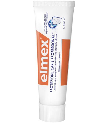 Protezione Carie Professional Elmex DentifricioIl dentifricio elmex Protezione Carie Professional dona ai denti una protezione dalla carie altamente efficace. Gli acidi derivati dallo zucchero presenti nella placca possono indebolire i denti e causare la carie. elmex Protezione carie con l'innovativa tecnologia neutralizzatore degli acidi dello zucchero con la combinazione di calcio, arginina e fluoro, aiuta a combattere direttamente gli acidi derivati dallo zucchero nella placca prima che possano danneggiare i denti.FormatoTubo minitaglia da 20ml. ...
