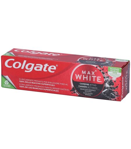 Indicazioni: Dentrificio sbiancante. Modo d'uso: Non adatto ai bambini al di sotto dei 7 anni di etá. Caratteristiche: Colgate Max White Carbon è un dentifricio sbiancante al fluoruro. Clinicamente provato per rimuovere fino al 100% delle macchie superficiali. Colgate Max White Carbon è un dentifricio sbiancante minerale delicato. Ingredienti: Fluoruro di Sodio (1450 ppm F⁻), Aqua, Hydrated Silica, Sorbitol, Hydrated Silica, Peg-12, Tetrapotassium Pyrophosphate, Aroma, Sodium Lauryl Sulfate, Aroma, Potassium Hydroxide, Cellulose Gum, Phosphoric Acid, Cocamidopropyl Betaine, Sodium Fluoride, Sodium Saccharin, Xanthan Gum, Mica, Charcoal Powder, Limonene, CI 74160 ...