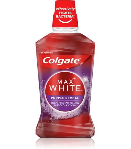 Colgate Max White Purple Reveal, 500 ml, Collutori unisex, Il collutorio Colgate Max White Purple Reveal rafforza l'effetto dei dentifrici sbiancanti e ridona luminosità al tuo sorriso. Caratteristiche: combatte la carie mantiene le gengive sane uccide i batteri protezione antiplacca garantisce un alito fresco favorisce lo sbiancamento dei denti Modo d’uso: Dopo la pulizia dei denti, sciacquare la bocca con il collutorio per il tempo specificato sulla confezione, quindi sputare. ...
