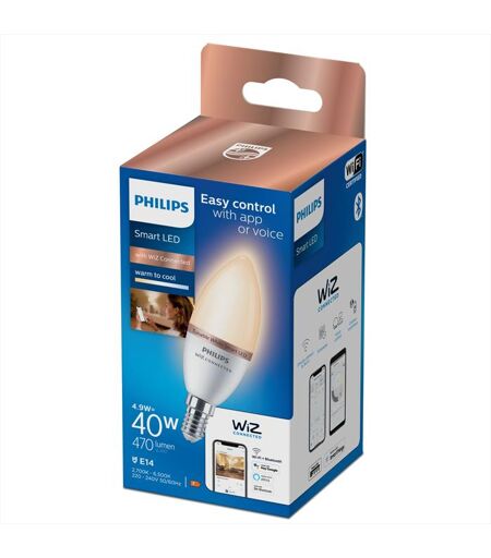 Lampada a LED - Potenza 4,9 Watt - Attacco E14 - Con Funzione dimming - 470 lm - Classe energetica F - Philips Oliva C37 E14. Tipo: Lampadina intelligente, Colore del prodotto: Bianco, Attacco lampada: E14. Classe efficienza energetica: F, Consumo di energia per 1.000 ore: 5 kWh, Tensione di ingresso AC: 220 - 240 V. Larghezza: 39 mm, Profondità: 116 mm, Altezza: 116 mm. Larghezza imballo: 7 mm, Profondità imballo: 70 mm, Altezza imballo: 16 mm. Quantità per pacco: 1 pz ...