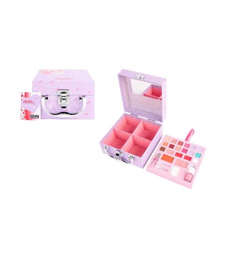 Robusto astuccio porta trucchi in cartone di Create It! per bambine. L'astuccio ha una maniglia e una chiusura a clip in metallo, uno specchio nel coperchio, un kit per il trucco da 24 pezzi e uno spazio segreto con scomparti. L'astuccio viola/rosa ha una divertente stampa all-over. ...