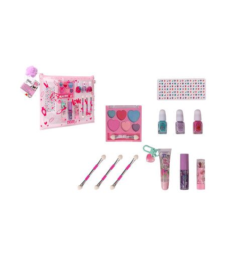 Questa borsa trasparente e' perfetta per pigiama party, viaggi, scuola o vacanze. La trousse porta trucchi Create it! contiene smalto, ombretto, lucidalabbra, rossetto, adesivi per unghie e un pennello bifacciale. Oltre al trucco incluso nella borsa, puoi portare con te anche il tuo trucco. La borsa e' trasparente, cosi' puoi vedere subito dove e' finito il lucidalabbra. Aggiungi un tocco di colore alla tua giornata con questa fantastica bustina! ...