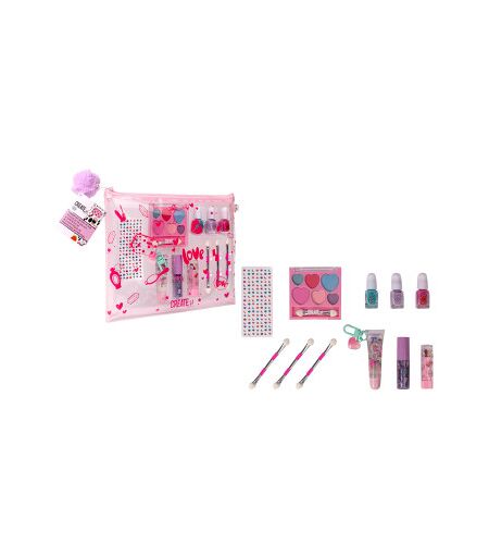Il set di cosmetici Create it contiene un rossetto, 2 lucidalabbra, uno dei quali in un tubetto con un moschettone per agganciarlo come un portachiavi, 3 smalti per unghie, una palette con 3 ombretti, un set di adesivi glitterati e una trousse trasparente con cerniera. Tutto nelle tonalita' del rosa, del blu e del viola. I cosmetici sono resistenti, brillanti e sicuri per i bambini. Un regalo fantastico per le ragazze che hanno appena iniziato la loro avventura con il trucco. ...