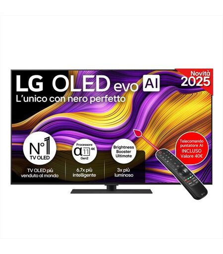 Smart TV OLED 55" - Ultra HD 4K - Con Internet TV - 4 HDMI - 120 Hz - DLNA - WiFi + Ethernet - Con sintonizzatore DVB-T2 HEVC - Con Common Interface e Common Interface + - Classe energetica E - LG OLED evo OLED55G56LS TV AI Serie G5S 55'' 4K, a11 Gen2, Brightness Booster Ultimate, 60W, 4 HDMI 165Hz, Smart TV 2025. Dimensioni diagonale schermo: 139,7 cm (55"), Risoluzione del display: 3840 x 2160 Pixel, Tipologia HD: 4K Ultra HD, Tecnologia display: OLED evo, Forma dello schermo: Piatto. Smart TV. Tecnologia di interpolazione del movimento: OLED Motion, Tempo di risposta: 0,1 ms, Rapporto d'aspetto nativo: 16:9. Formato del segnale digitale: DVB-S, DVB-S2, DVB-T, DVB-T2. Wi-Fi, Collegamento ethernet LAN. ...